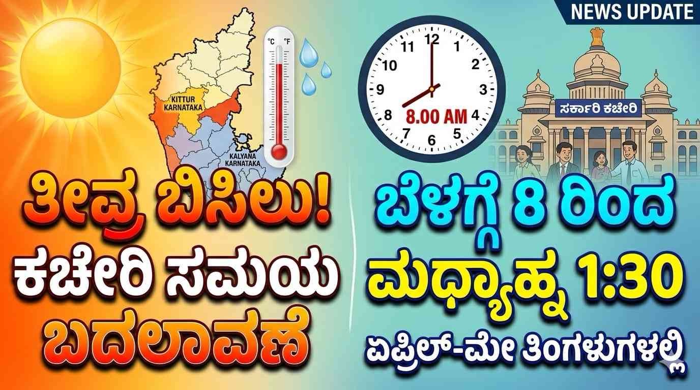 ರಾಜ್ಯದಲ್ಲಿ ದಿನದಿಂದ ದಿನಕ್ಕೆ ಏರುತ್ತಿರುವ ಬಿಸಿಲಿನ ತಾಪಮಾನವನ್ನು ಗಮನದಲ್ಲಿಟ್ಟುಕೊಂಡು, ಕರ್ನಾಟಕ ಸರ್ಕಾರ ಮಹತ್ವದ ನಿರ್ಧಾರ ಕೈಗೊಂಡಿದೆ. ಸಾರ್ವಜನಿಕರು ಹಾಗೂ ಸರ್ಕಾರಿ ನೌಕರರ ಹಿತದೃಷ್ಟಿಯಿಂದ, ಏಪ್ರಿಲ್ ಮತ್ತು ಮೇ ತಿಂಗಳ ಅವಧಿಗೆ ಕೆಲವು ಜಿಲ್ಲೆಗಳಲ್ಲಿ ಸರ್ಕಾರಿ ಕಚೇರಿ ವೇಳೆಯನ್ನು ಬದಲಾಯಿಸಲಾಗಿದೆ.