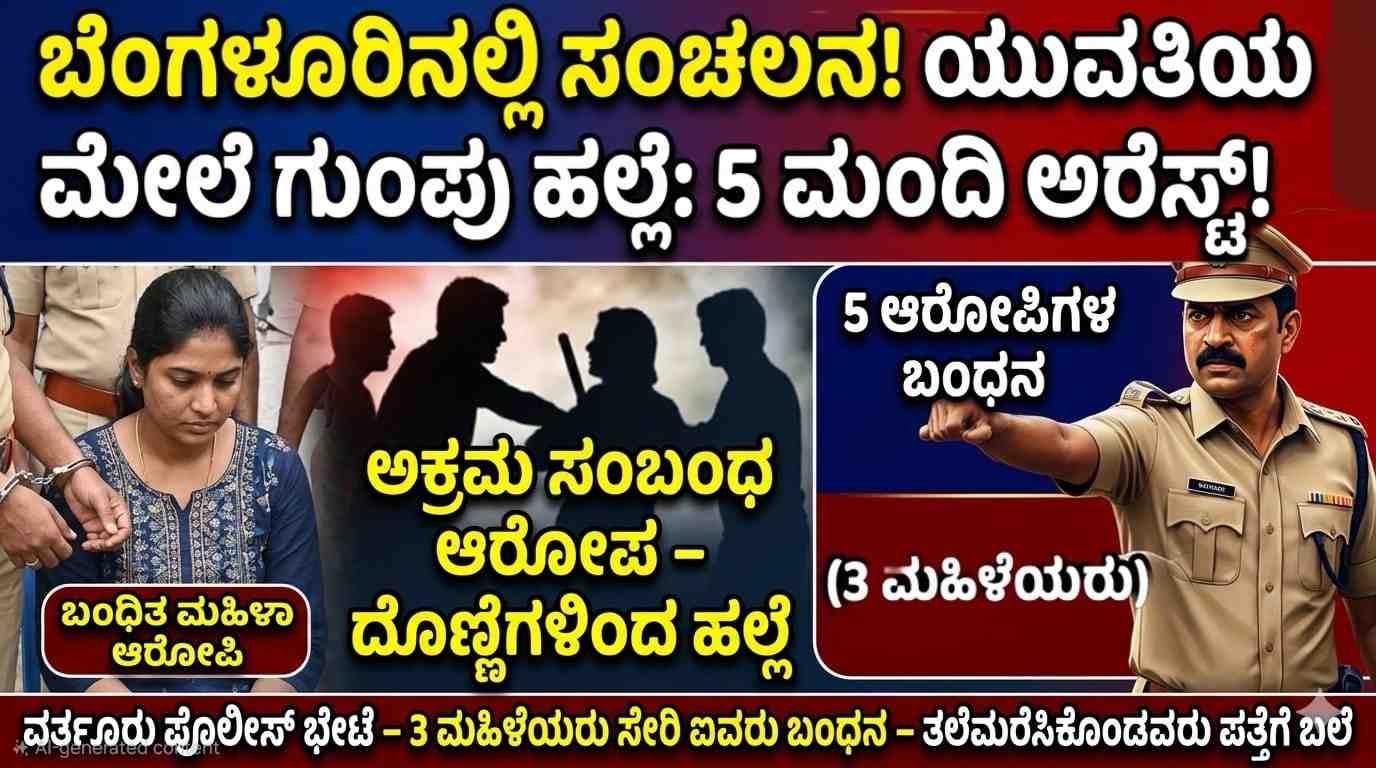 ಬೆಂಗಳೂರು ನಗರದ ವರ್ತೂರು ಪೊಲೀಸ್ ಠಾಣಾ ವ್ಯಾಪ್ತಿಯಲ್ಲಿ ಅಕ್ರಮ ಸಂಬಂಧ ಹೊಂದಿದ್ದಾಳೆ ಎಂಬ ಆರೋಪದ ಹಿನ್ನೆಲೆ ಯುವತಿಯೊಬ್ಬಳ ಮೇಲೆ ಗುಂಪು ಹಲ್ಲೆ ನಡೆಸಿದ ಘಟನೆ ಬೆಳಕಿಗೆ ಬಂದಿದೆ. ಈ ಸಂಬಂಧ ಮೂರು ಮಹಿಳೆಯರು ಸೇರಿದಂತೆ ಐವರನ್ನು ಪೊಲೀಸರು ಬಂಧಿಸಿದ್ದು, ಇನ್ನೂ ಮೂವರು ಆರೋಪಿಗಳು ತಲೆಮರೆಸಿಕೊಂಡಿದ್ದಾರೆ.