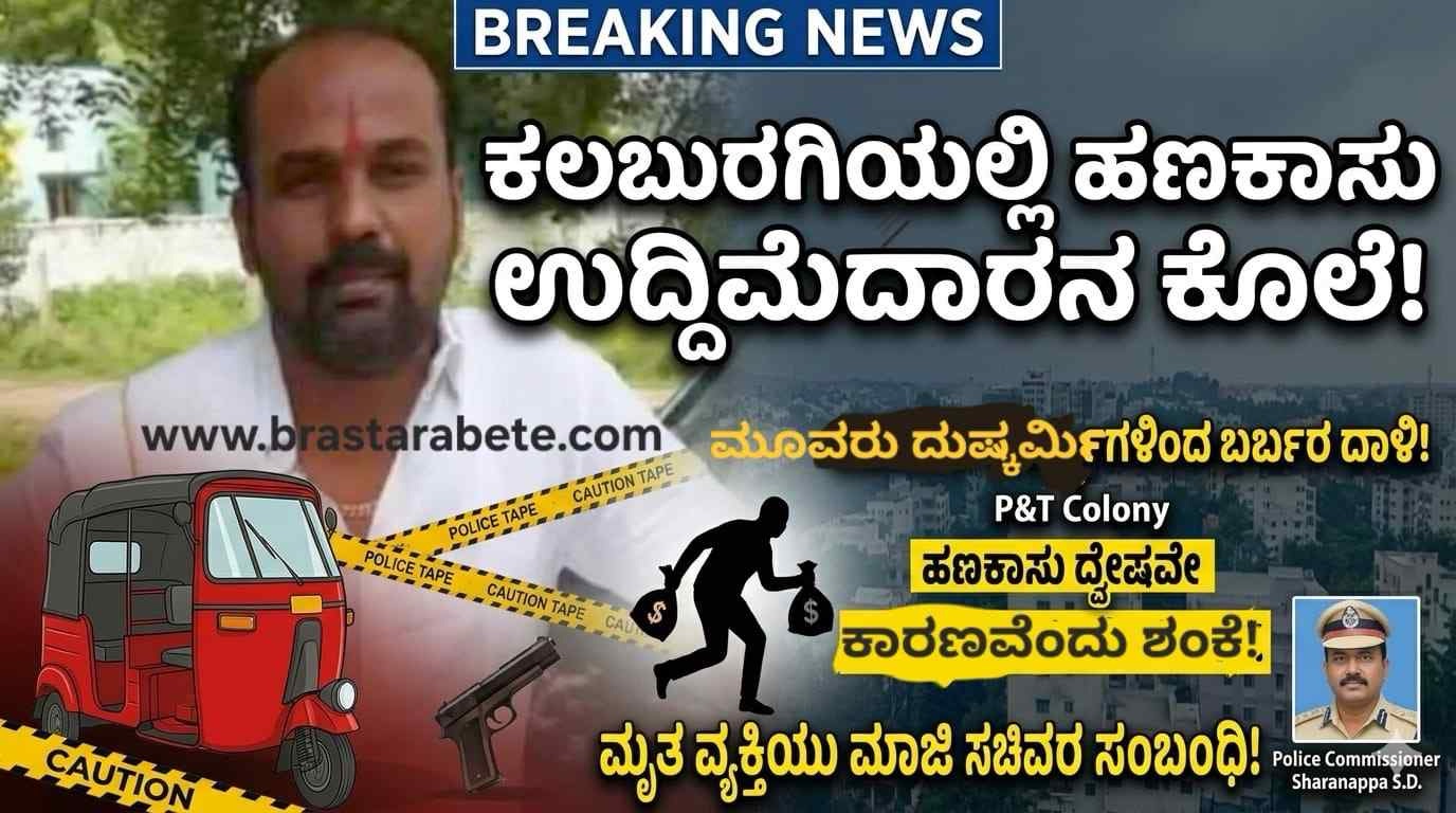 ಕಲಬುರಗಿ ನಗರದ ಹಳೇ ಜೇವರ್ಗಿ ರಸ್ತೆಯ ಪಿ & ಟಿ ಕಾಲೊನಿಯಲ್ಲಿ ಗುರುವಾರ ರಾತ್ರಿ ನಡೆದ ಭೀಕರ ಘಟನೆಯಲ್ಲಿ ವ್ಯಕ್ತಿಯೊಬ್ಬರನ್ನು ದುಷ್ಕರ್ಮಿಗಳು ಮಾರಕಾಸ್ತ್ರಗಳಿಂದ ಹಲ್ಲೆ ನಡೆಸಿ ಬರ್ಬರವಾಗಿ ಹತ್ಯೆಗೈದು ಪರಾರಿಯಾಗಿದ್ದಾರೆ.