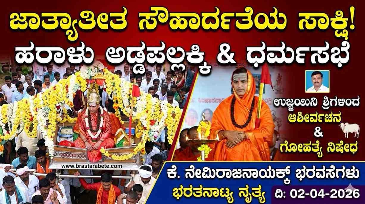 ಕೊಟ್ಟೂರು:- ತಾಲ್ಲೂಕಿನ ಹರಾಳು ಗ್ರಾಮದಲ್ಲಿ ದಿನಾಂಕ 02-04-2026 ಗುರುವಾರದಂದು ಆಗಮಿಸಿದ ಶ್ರೀ ಉಜ್ಜಯಿನಿ ಜಗದ್ಗುರುಗಳನ್ನು ಅಡ್ಡಪಲ್ಲಕ್ಕಿಯಲ್ಲಿ ಕುಳ್ಳಿರಿಸಿ, ಸಮ್ಮಳ ವಾದ್ಯ, ಡೊಳ್ಳು ಕುಣಿತ, ಮತ್ತು ಕನ್ಯಾಮಣಿಯರು ಹಾಗೂ ಸುಮಂಗಲೆಯರಿಂದ ಕಳಸ, ಕುಂಭಮೇಳದೊಂದಿಗೆ ಊರಿನ ಪ್ರಮುಖ ಬೀದಿಗಳಲ್ಲಿ ಭವ್ಯ ಮೆರವಣಿಗೆಯ ಮೂಲಕ ಅದ್ದೂರಿಯಾಗಿ ಗ್ರಾಮಸ್ಥರು ಸ್ವಾಗತಿಸಿದರು.