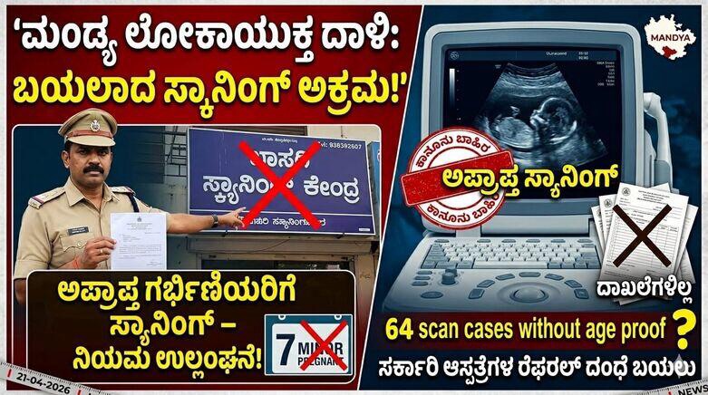 ಮಂಡ್ಯ ಜಿಲ್ಲೆಯ ಕೆ.ಆರ್.ಪೇಟೆ ಭಾಗದಲ್ಲಿನ ಖಾಸಗಿ ಸ್ಕ್ಯಾನಿಂಗ್ ಸೆಂಟರ್ಗಳಲ್ಲಿ ಗಂಭೀರ ನಿಯಮ ಉಲ್ಲಂಘನೆಗಳು ನಡೆದಿರುವುದು ಲೋಕಾಯುಕ್ತ ಅಧಿಕಾರಿಗಳ ದಾಳಿಯಲ್ಲಿ ಬೆಳಕಿಗೆ ಬಂದಿದೆ. ಅಪ್ರಾಪ್ತ ಗರ್ಭಿಣಿಯರಿಗೆ ಸ್ಕ್ಯಾನಿಂಗ್ ನಡೆಸಿರುವುದು ಸೇರಿದಂತೆ ಹಲವು ಅಕ್ರಮಗಳು ಪತ್ತೆಯಾಗಿವೆ.