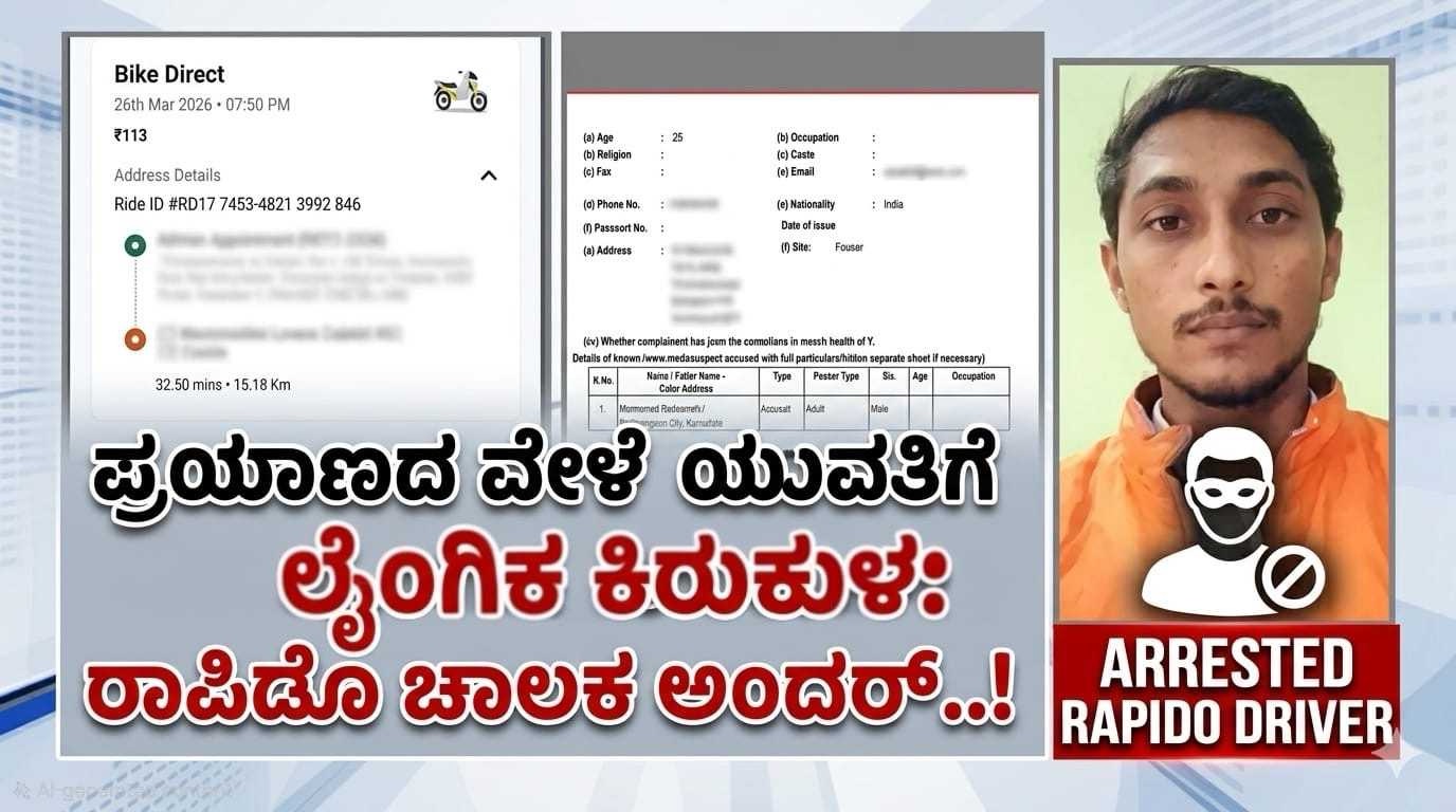 ಬಂಧಿತನನ್ನು ಮೊಹಮ್ಮದ್ ಖಾಜಾ ಎಂದು ಗುರುತಿಸಲಾಗಿದೆ. ಯುವತಿ ಬಿ.ಟಿ.ಎಂ ಲೇಔಟ್‌ನಿಂದ ಇಂದಿರಾನಗರಕ್ಕೆ ತೆರಳಲು ರಾಪಿಡೋ ಸೇವೆಯನ್ನು ಬುಕ್ ಮಾಡಿದ್ದಳು. ಈ ವೇಳೆ ಪ್ರಯಾಣದ ಅವಧಿಯಲ್ಲೇ ಚಾಲಕ ಅಸಭ್ಯವಾಗಿ ವರ್ತಿಸಿ, ಯುವತಿಯ ದೇಹಕ್ಕೆ ಅನಾಚಾರವಾಗಿ ಸ್ಪರ್ಶ ಮಾಡುತ್ತಿದ್ದಾನೆ ಎಂಬ ಆರೋಪ ಕೇಳಿಬಂದಿದೆ.